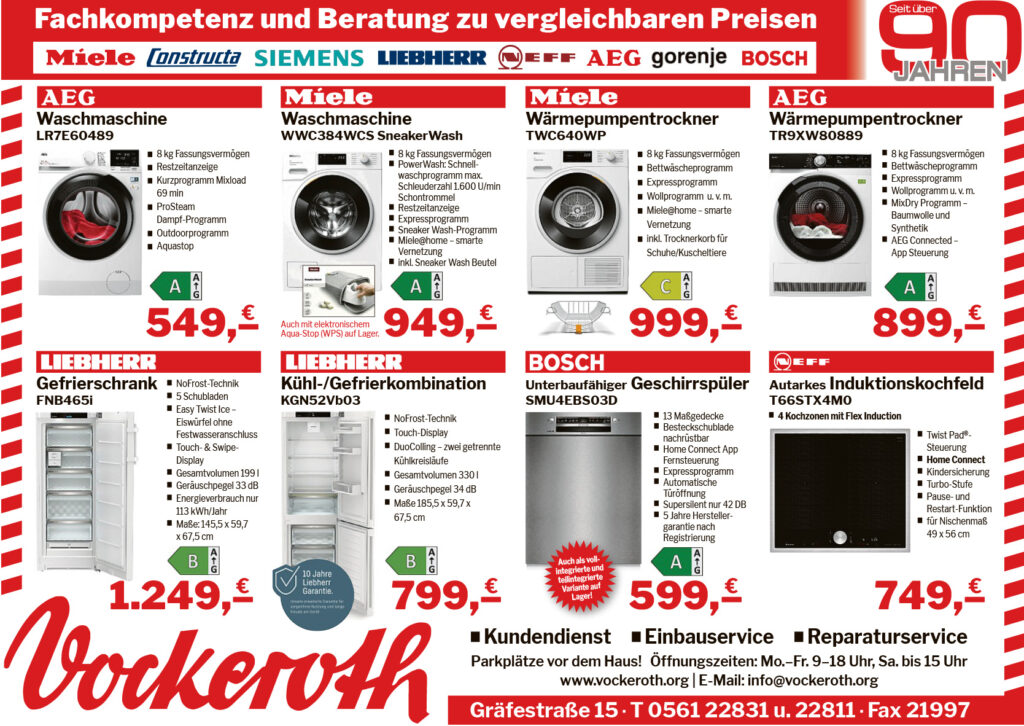 Unsere Monteure sind für Sie auch in der Krisenzeit im Einsatz, sei es zum Liefern oder zum Reparieren. Und über unsere Webseite können Sie Produkte aus unserem erweiterten Angebotssortiment reservieren. Schauen Sie sich um, wir haben wieder mal hochwertige Hausgeräte zu attraktiven Preisen für Sie ausgewählt.